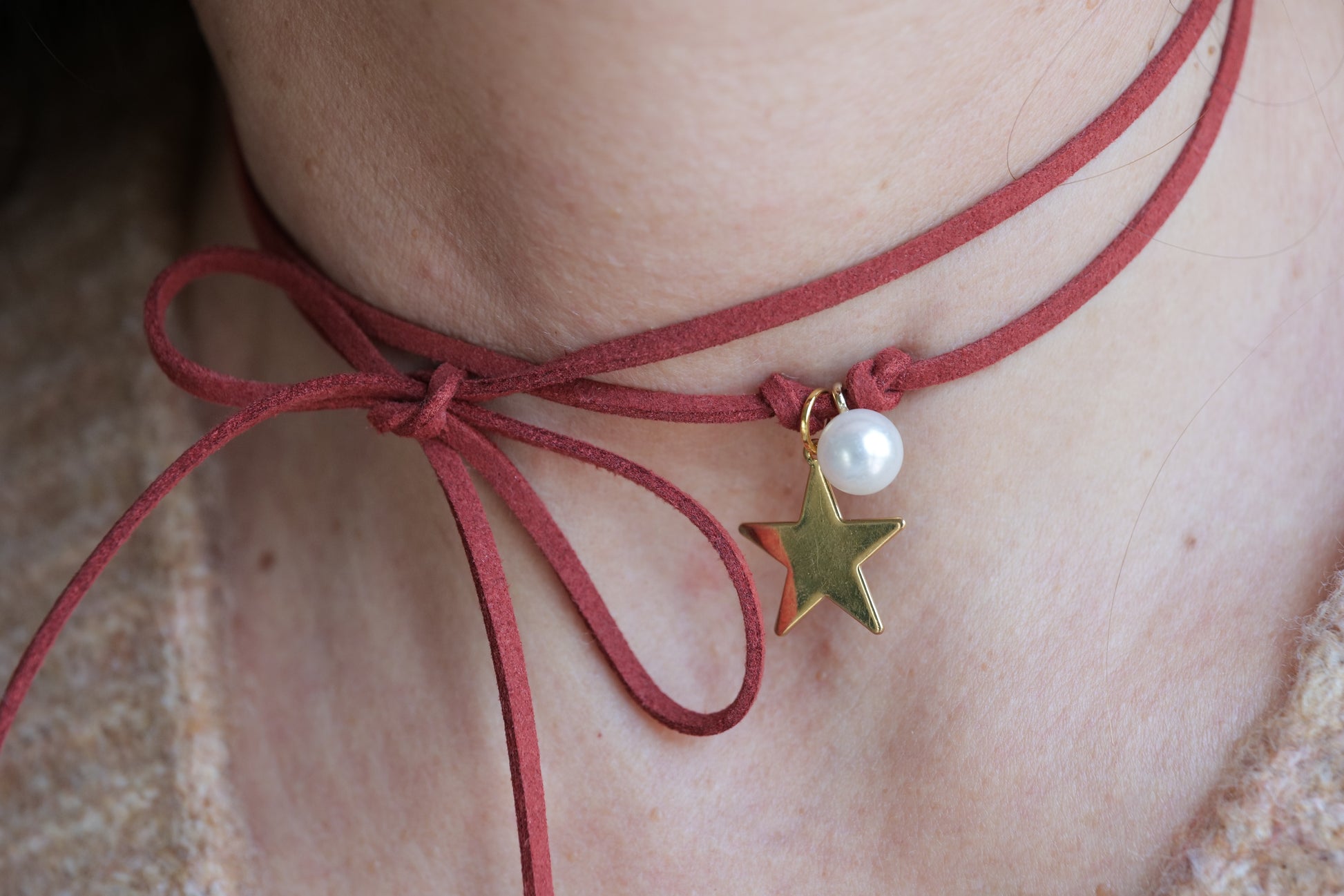 Un cordino alcantara bordeaux impreziosito da piccolo charm che raccontano stile e dettagli unici. Semplice , raffinata , perfetta per aggiungere un tocco di colore e personalità a ogni look .